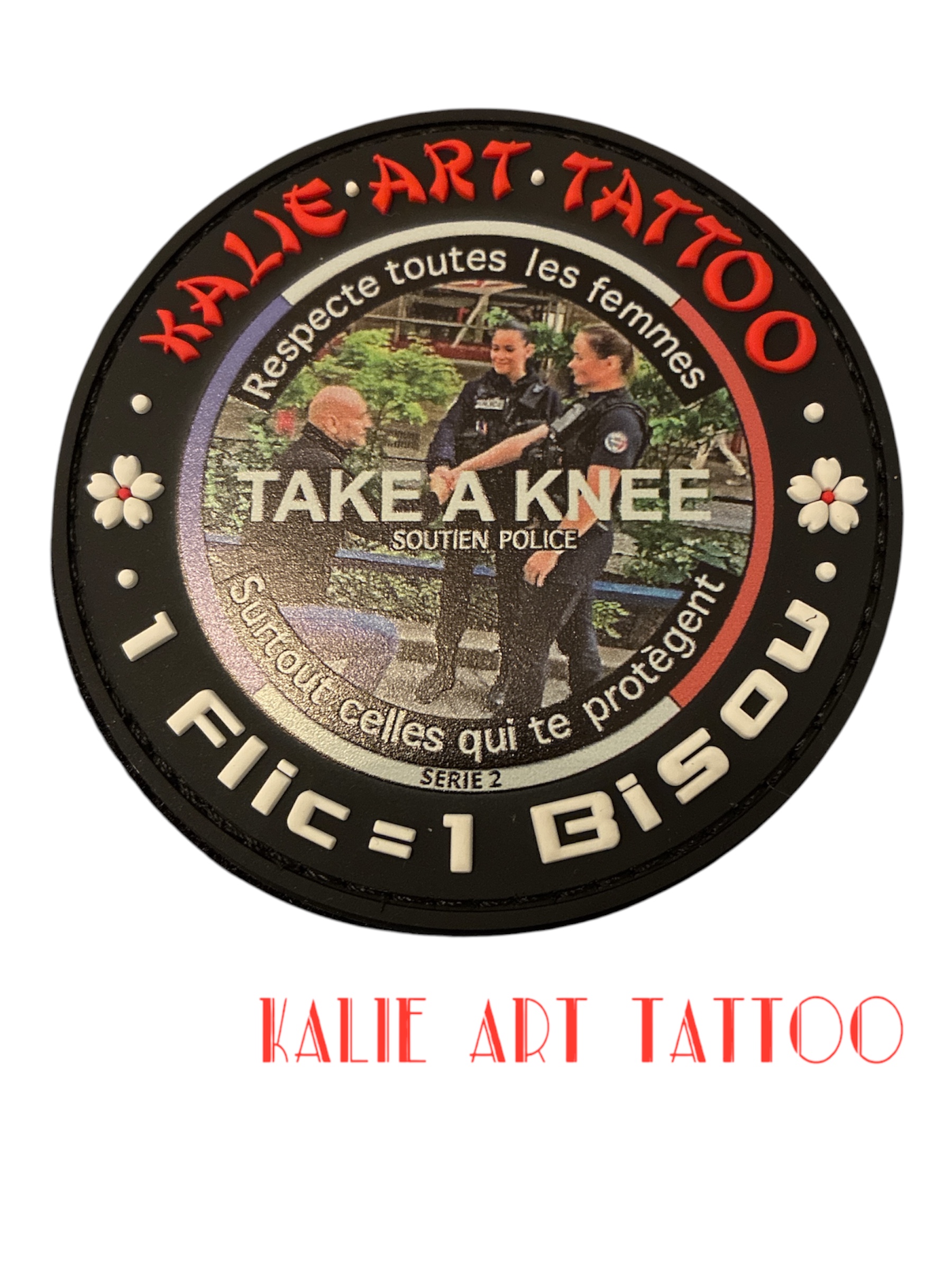 La signature « 1 flic = 1 bisou » apporte la touche emblématique de la collection Kalie Art Tattoo, mêlant message engagé et identité artistique.
