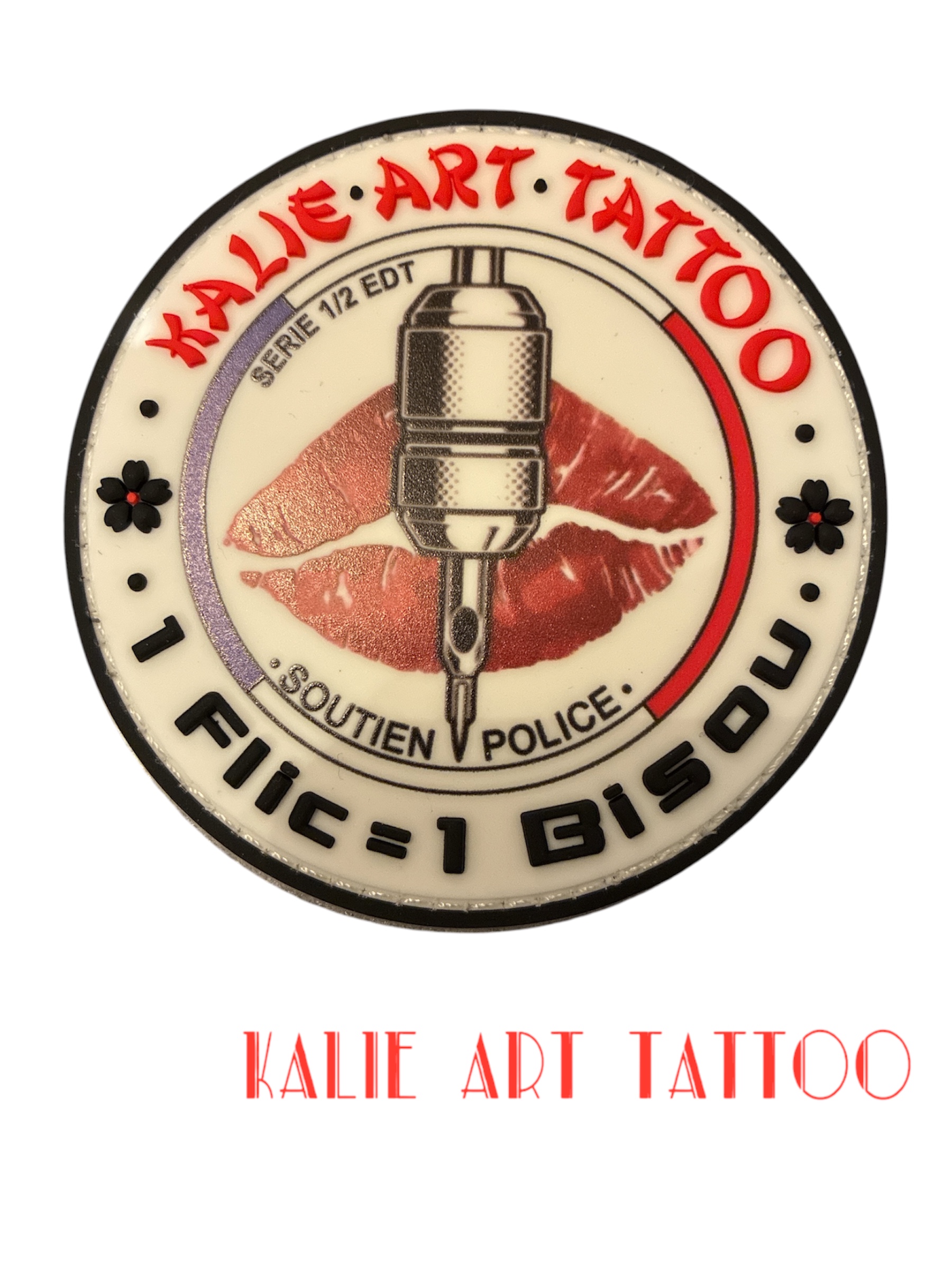 Son visuel unique met en avant le message « 1 flic = 1 bisou », apportant une touche décalée et artistique, fidèle à l’univers Kalie Art Tattoo.